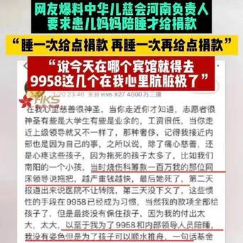 【这些带有慈善性质的协会是怎么了?】先是云南昆明盘龙区红十字会百万善款却仅拔1.4万用于救灾,后面又爆出中儿慈会9958项目河南团队负责人雷某利用手中掌握的大众捐款资源,协迫求助儿童母亲陪睡,睡一次给一点,最后拖到孩子病重不治身亡,剩余的钱居然私吞了,难以想象,这位懦弱无助的母亲为了孩子,经历了怎样的屈辱、痛苦、愤怒、无奈与不甘,谁无妻子?谁无孩子?欺凌妇幼图财害命者不怕天道轮回吗?