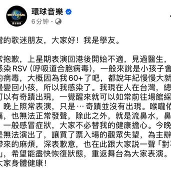 【张学友回应演唱会取消】张学友60+巡回演唱会台北站第四场,因张学友身体原因确定取消。因为距离开场仅有四个小时,临时取消演唱会引发部分粉丝不满,张学友发文向粉丝道歉。 张学友表示上星期表演回港后开始不适,可能是年龄60+的原因,确证感染RSV(呼吸道合胞病毒),喉咙痛无法正常发声,还有流鼻水、鼻塞等一般感冒症状。 粉丝也都表示谅解,希望张学友能尽快恢复状态,重返舞台为大家表演。#娱乐圈的那些风云#